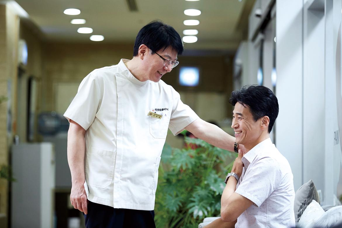 세연통증클리닉의 최봉춘(崔鳳春·58) 원장과 이경호씨의 인연은 꽤 오래전으로 거슬러 올라간다. 무려 20년의 시간이다. 1997년 이씨는 허리가 아파 이 병원 저 병원을 옮겨 다니다 최봉춘 원장 덕분에 겨우 정상생활을 할 수 있었고, 관리를 위해 계속 인연을 유지했다. 최 원장은 이씨와는 이제 편하게 이야기를 나눌 수 있는 사이라고 했다.
