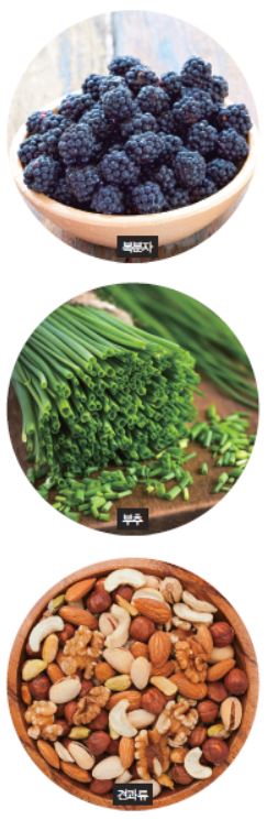셋째, 견과류다. 호두, 연자육, 은행, 잣, 밤 등 딱딱한 견과류는 구멍을 단단하게 틀어막는 효과가 있는데 겨울에 땀구멍을 막아 추위를 이기게 해준다. 그래서 정월에 부럼을 먹는다. 방광 속 물탱크의 수도꼭지도 틀어막아줘 노인들에게 도움이 되는 음식이다. 단 견과류를 먹을 때는 먹기 직전에 껍질을 까서 먹는 것이 좋다. 견과류의 지질이 공기 중에 오래 노출될 경우 산화되어 몸에 해롭기 때문이다. 곡식 중에서는 좁쌀이 견과류와 같은 효과가 있다.