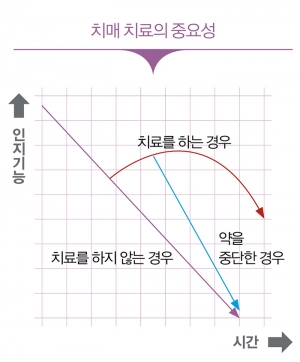 치료약의 복용 유무와 시간의 흐름에 따라 나타날 수 있는 인지기능 저하 정도를 나타낸 그래프.