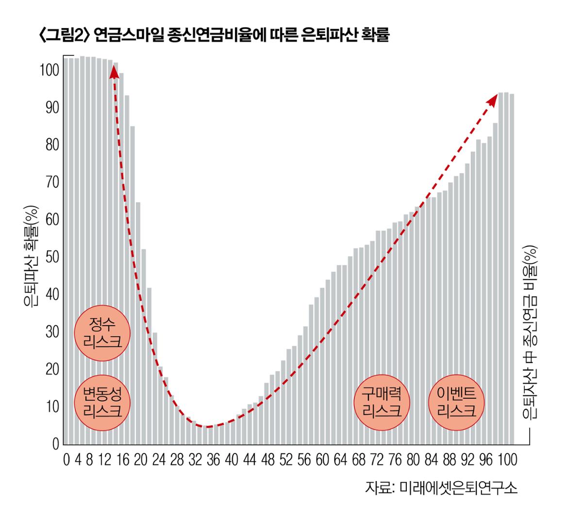 이제 60대 연금술의 전략이라 할 수 있는 ‘은퇴자의 유동성 함정’ 피하기에 대해 살펴보자. 미래에셋은퇴연구소에 따르면, 사망할 때까지 연금이 나오는 종신연금의 적정비율은 은퇴 자산의 규모, 국민연금 수령액, 주택연금 가입금액 등에 따라 달라지는데, 은퇴파산 확률이 가장 낮은 종신연금의 비중은 24~42%라고 한다. 종신연금의 비율이 24% 이하로 떨어지면 장수 리스크와 변동성리스크 때문에, 42%를 넘게 되면 구매력리스크와 이벤트리스크 때문에 은퇴파산 가능성이 높아진다(<그림2> 참조). 모든 자산을 종신연금으로 전환해버리면 은퇴파산 확률이 90%로 올라가는데, 이는 일반 국민들이 이용하는 사적연금의 경우 연금액이 일정 금액으로 고정되어 있어 인플레이션에 취약하고, 이 상황에서 질병이나 사고 등 큰 금액의 지출이 생기는 일이 발생하면 대응하기 힘들기 때문이다.