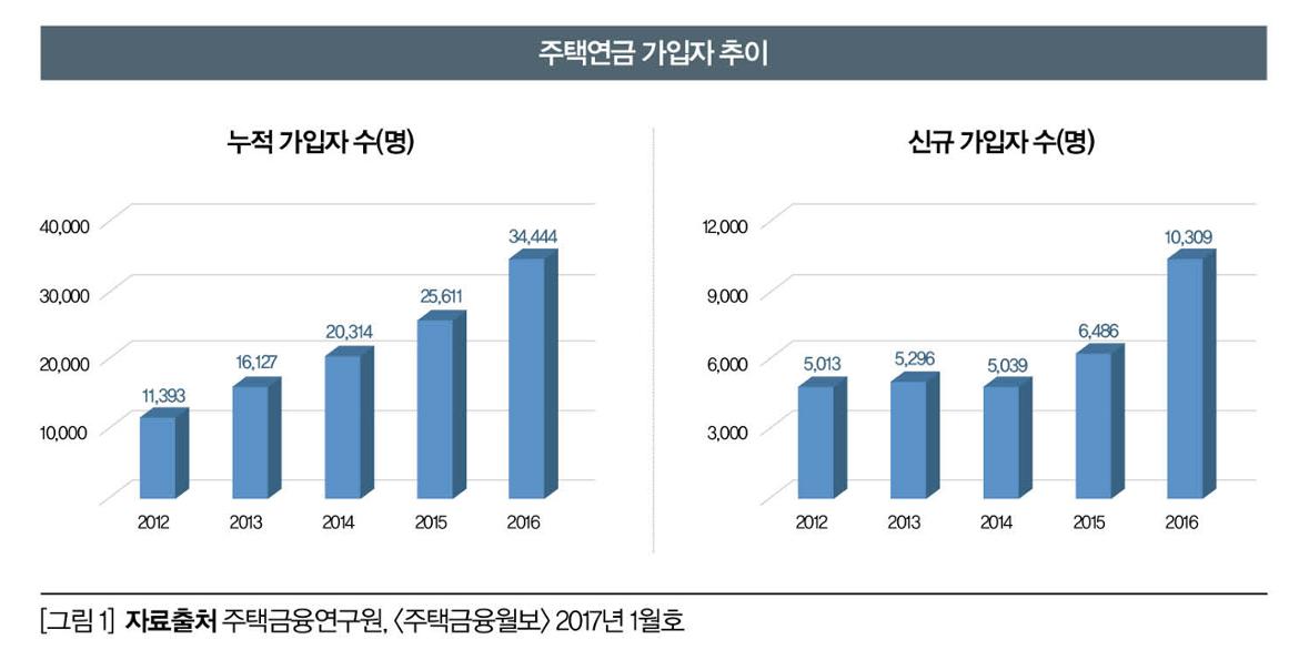 주택연금은 2007년 7월에 도입된 이후 가입자 수가 꾸준히 늘어나고 있다. 누적 가입자 수는 2012년 말 1만1393명에서 2016년 말에는 3만4444명으로 증가했다. 매년 주택연금에 가입하는 신규 가입자 수는 2012~2015년 5000~6000명 선에서 2016년 처음으로 1만 명을 넘어서기에 이르렀다([그림 1] 참조). 2016년 신규 가입자 수(1만309명)는 2015년보다 58.9% 증가한 수치다. 이처럼 지난해 주택연금 신규 가입자 수가 크게 늘어난 것은 ‘내집연금’ 3종 세트 출시와 가입요건 완화 덕분이다. 주택연금이 고령층의 주요 노후준비 수단으로 자리 잡았음을 보여준다.