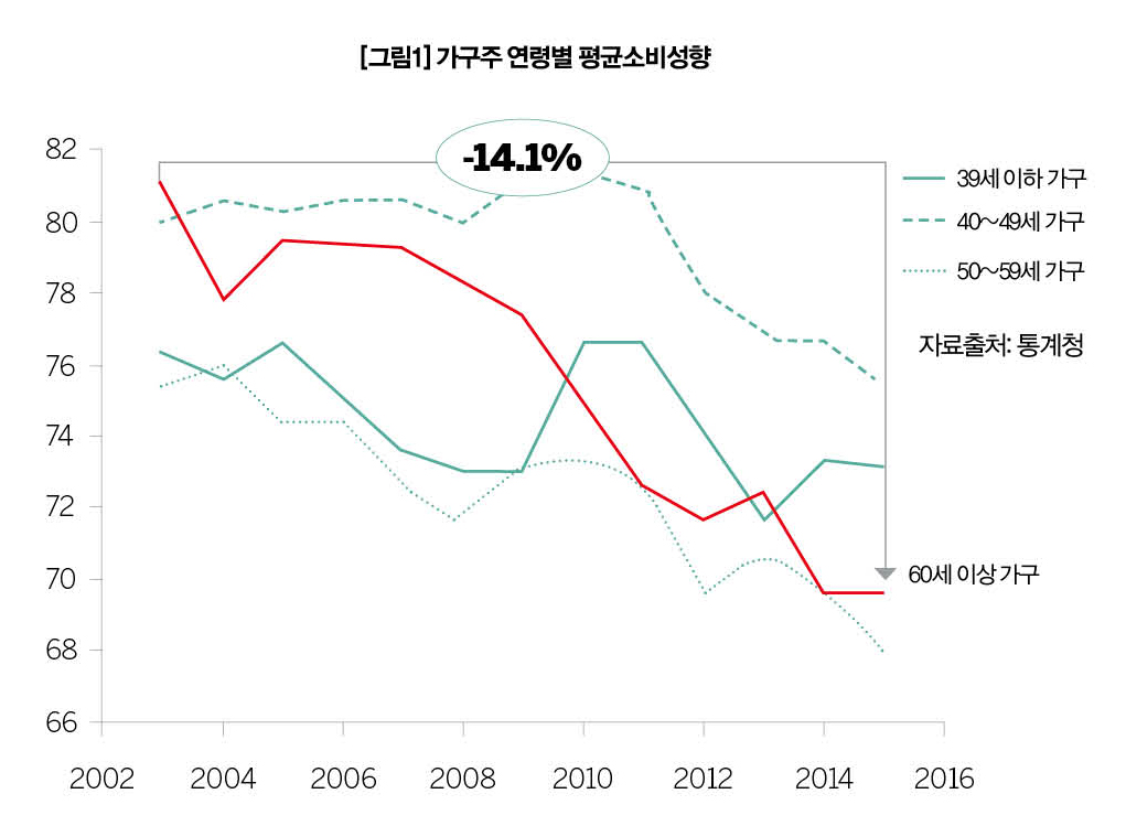 생애주기 가설에 따르면, 사람들은 생애에 걸쳐 균일한 소비를 유지하기 위해 소득이 많은 시기에 저축을 해 소득이 적은 은퇴 이후를 대비한다. 몸에 배인 소비습관은 하루아침에 바뀌지 않는다. 이런 소비의 하방경직성을 무시하고 소비를 급격하게 줄이면 엄청난 스트레스에 직면해 원치 않는 질병을 초래할 수도 있다. 그런데 우리나라 사람들은 이론과 달리 나이가 들면서 소비를 급속히 줄이고 있다. 60세 이상 가구의 소비는 2003년 대비 14%나 줄어들었다. 줄어드는 소득에 맞추다 보니 마른 수건을 짜고 있는 셈이다. 60세 이상 고령자의 총소득에서 근로소득을 제외하면 2017년 2인 가구 최저생계비 수준(약 170만원)의 소득만 얻고 있다. 근로를 하지 않으면 생계마저 간당간당해지는 것이다. 어쩔 수 없이 마른 수건 짜듯 소비를 줄인다. 은퇴 생활이 즐거울 리 없다.