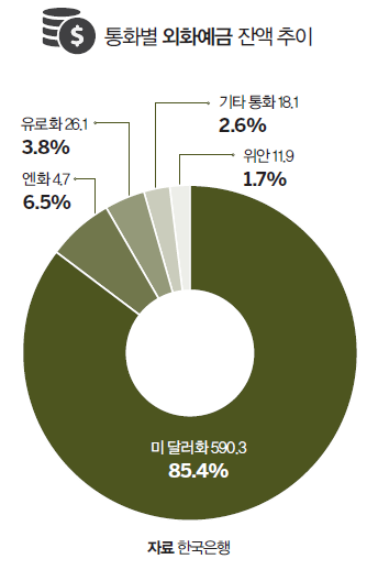 한국은행에 따르면 지난 7월 개인 달러화 예금잔액은 105억2000만 달러로 역대 최 대 규모를 자랑했다. 전월보다 5억3000만 달러가 증가했다. 이 중 달러화 예금이 48 억4000만 달러가 증가했고, 엔화 예금이 4억7000달러 늘었다.