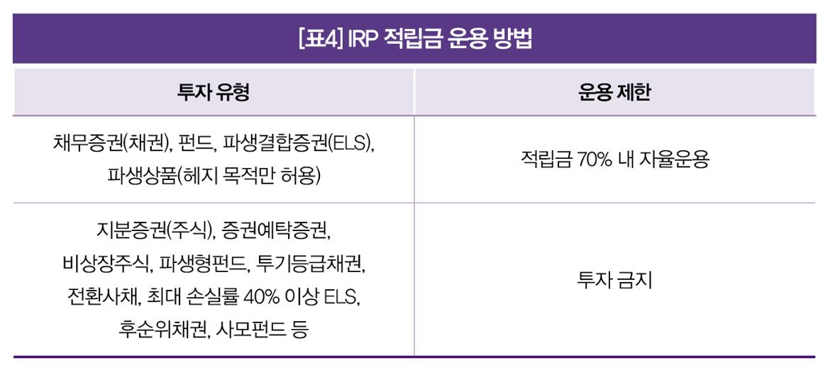 계좌를 개설했으면 그다음은 계좌에 들어갈 적립금을 어떻게 운용할지 결정해야 한다. [표4]에서 보는 것처럼 IRP 가입자가 선택할 수 있는 상품도 있고, 선택할 수 없는 상품도 있다.