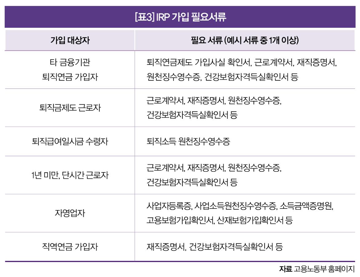 절세상품이 줄어들고 있는 요즘 절세덩어리인 IRP는 매우 매력적이다. IRP 가입절차는 의외로 간단하다. 신분증과 [표3]과 같은 필요서류를 준비해 금융기관을 방문하면 그만이다. 일부 금융기관에서는 공인인증서만 있으면 온라인으로도 가입할 수 있으니 업무시간 중 금융기관을 방문하기 힘든 사람들은 이를 활용하면 된다. 계좌를 개설할 때는 0원으로도 가능하다