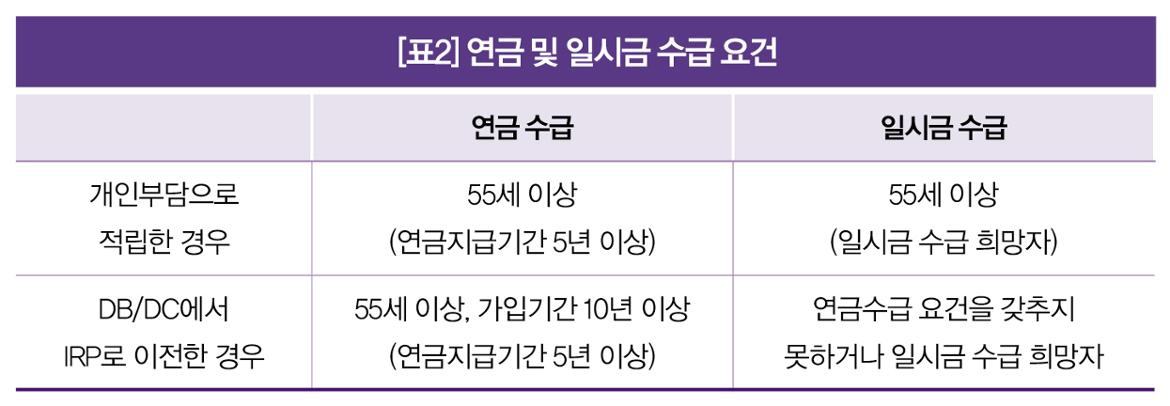 IRP에 대한 세제혜택은 또 있다. 바로 퇴직금을 IRP 계좌에 넣어두고 운용하다 55세 이후에 연금으로 수령하면 퇴직소득세를 30%나 줄일 수 있다는 점이다(연금수급 자격에 대해선 [표2] 참조). 많은 사람이 퇴직할 때 퇴직금을 일시금으로 받아간다. 퇴직금을 일시금으로 받게 되면 퇴직금 규모와 근속기간에 따라 0~28.6%의 퇴직소득세를 납부해야 한다. 실제로 받는 퇴직금이 생각보다 적은 이유다. 그러나 퇴직금을 IRP 계좌로 이체한 뒤 연금으로 받게 되면 퇴직소득세율의 70%만 연금소득세로 납부하면 된다. 퇴직소득세 대비 연금소득세가 30% 절감되도록 소득세법이 개정되었기 때문이다. 이미 퇴직금을 일시금으로 수령했다 하더라도 60일이 경과되지 않았다면 이미 납부한 퇴직소득세를 돌려받을 수 있다. 금융기관을 방문해 IRP 계좌를 개설한 뒤 수령한 퇴직금을 이체하면 퇴직한 회사에서 원천징수해둔 퇴직소득세를 IRP 계좌에 입금시켜주기 때문이다. 만일 퇴직금 중 일부를 사용했다면 남은 금액만 IRP 계좌에 입금해도 입금비율에 맞춰 퇴직소득세를 돌려받을 수 있다.