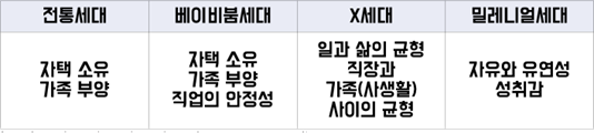 각 세대는 서로 다른 생애주기 만큼이나 열심히 일해서 얻고자 하는 것에도 차이가 있다. 전통세대는 자택을 소유하고 가족을 부양하기 위해 일했다. 전후 가족의 터전과 기반을 다지기 위해 주로 1차 산업에 종사하면서 불철주야 일했다. 베이비붐 세대도 크게 다르지 않다. 일을 통해 얻고자 하는 것은 부와 명예였으며 직업의 안정성도 중요했다. 전통세대나 베이비붐 세대는 공통으로 소유의 개념이 강하기 때문에 부동산 자산을 선호하고, 리스크 관리 차원에서 안전자산에 투자하는 성향이 강하다. 베이비붐 세대의 경우 보유자산 중 부동산이 차지하는 비중이 70~80%에 이른다. 60%대의 X세대나 50%에 못 미치는 밀레니얼 세대와 비교된다. 일본이나 미국과 비교해도 월등히 높은 수치다.
