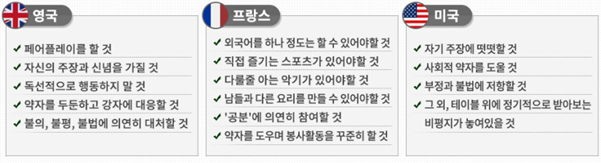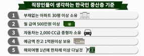 인터넷 검색 창에서 ‘국가별 중산층의 기준’이라는 키워드를 입력하면 우리나라와 다른 나라를 비교한 내용이 나온다. 우리나라는 부채 없는 30평 이상의 아파트 소유, 월 급여 500만 원 이상, 자동차는 2,000CC급 중형차 이상, 예금액 잔고는 1억 원 이상, 해외여행은 1년에 한 차례 이상 다니는 것 등이다. 반면 프랑스는 외국어를 하나 정도 하고, 직접 즐기는 스포츠가 있고, 악기를 연주할 수 있고, 남다른 맛을 낼 수 있는 요리를 할 수 있고, '공분' 에 참여하며, 약자를 도우며 봉사활동을 하는 것 등이다. 우리는 성공의 기준이 물질적인 가치에 치중된 경향이 있다. 압축성장의 결과일 수도 타인의 시선을 의식하는 국민성 때문일 수도 있다. 중요한 것은 물질적인 가치 외에도 보이지 않는 가치도 소중하게 생각하는 균형 잡힌 시각이 필요한 것은 분명해 보인다.