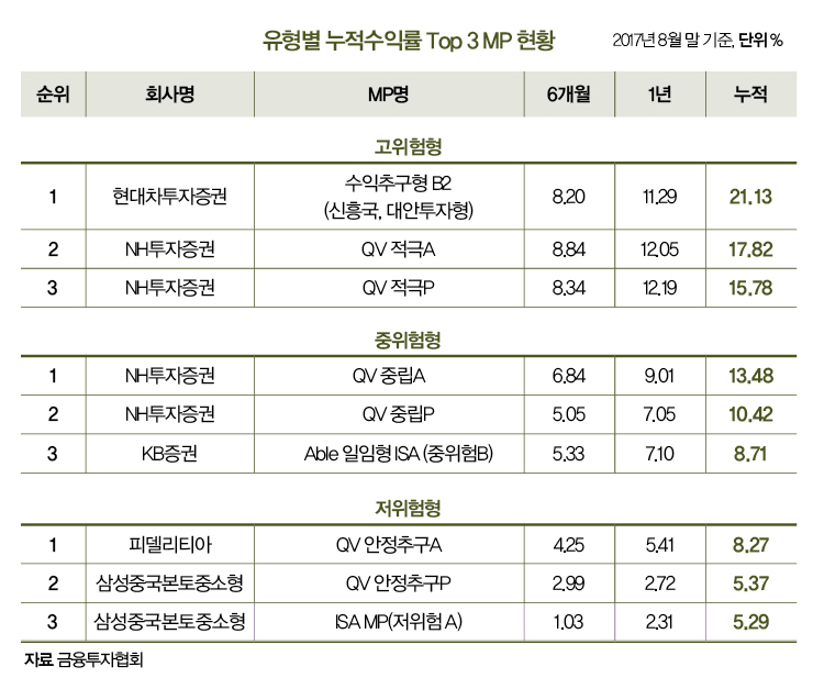 모델포트폴리오(MP)로 보면 초고위험이 12.69%로 가장 높고 고위험 9.02%, 중위험 5.37%, 저위험 2.95%, 초저위험 1.78%순이다. 위험 성향에 따라 모델포트폴리오를 선택하면 되는데, 고수익 추구형은 그만큼 위험이 높다는 점을 고려해야 한다.