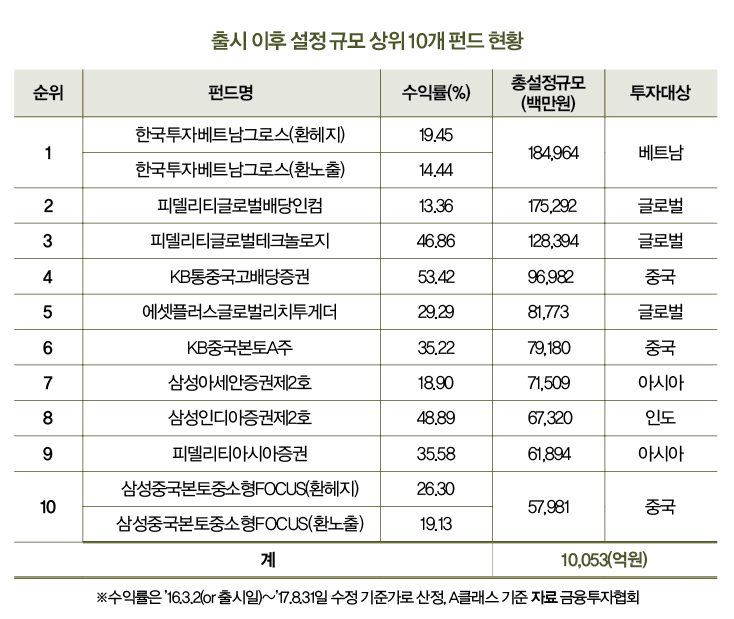 실제 비과세 해외주식형 펀드 출시 이후 지난 8월 말까지 설정 규모 상위 10개 펀드의 수익률은 13%에서 53% 수준이다. ‘KB통중국고배당증권’이 가장 높은 53.4%를 기록 중이고, ‘피델리티글로벌테크놀로지’는 46.8%다.