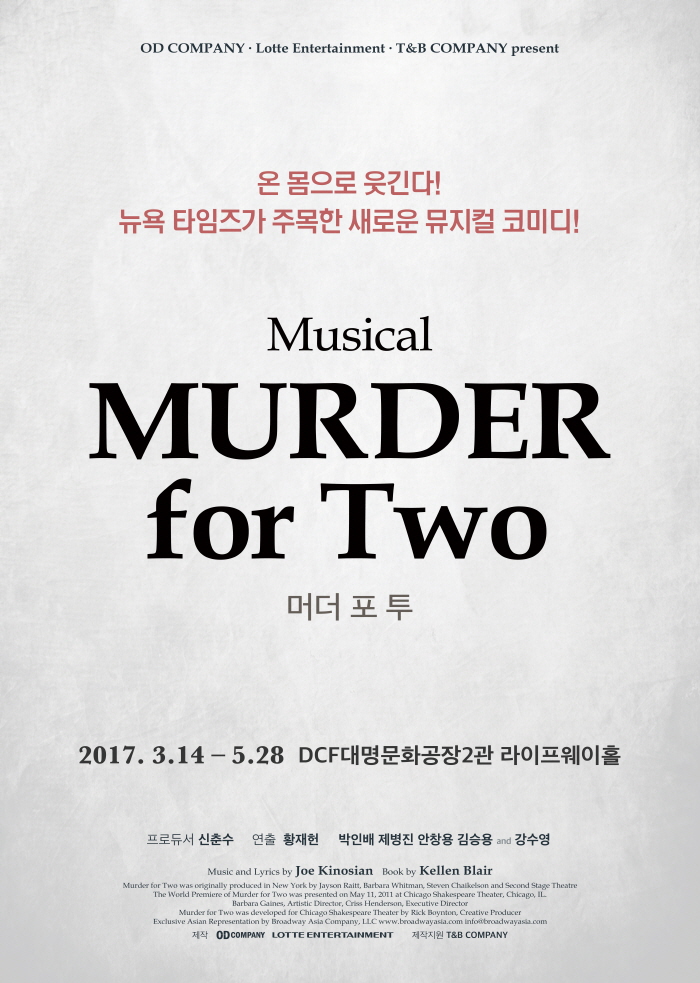 뉴욕타임스가 주목한 코미디 뮤지컬 <머더 포 투>의 국내 라이선스 첫 무대다. 두 명의 배우가 13명의 인물을 연기하며, 형사와 용의자 간의 실랑이를 그린 2인극이다. 의문의 총격 살인사건 범인을 찾아가는 추리극으로 빠른 전개가 흡입력을 높인다.