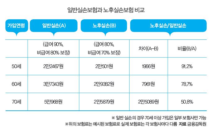 노후실손의료보험은 50세 이상부터 75세까지의 시니어들을 대상으로 민간보험회사에서 판매하는 보험이다. 보험사에서 정한 건강기준에 적합하면 가입할 수 있으며, 입원과 통원을 합산해 연간 1억원한도로 실제 발생한 의료비를 보장한다. 일반실손의료보험에 비해 자기부담금비율이 10~20% 높은 대신 보험료가 저렴하다. 자기부담금비율이 높아 치료비가 적게 발생하는 입원이나 통원 시의 혜택보다는, 고액의 치료비가 발생하는 경우에 대비해 가입을 고려해볼 만한 상품이다.