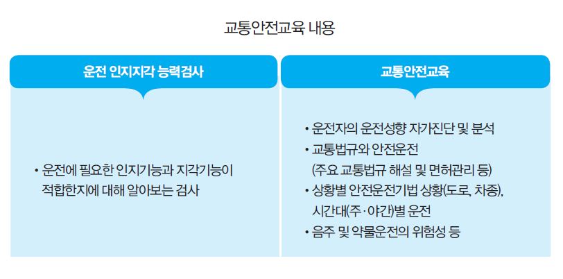 만 65세 이상의 운전자가 교통안전교육을 이수하면 자동차보험료의 5%를 할인해준다. 고령운전자 교통안전교육은 도로교통공단 13개 시도 지부에서 실시하며 비용은 무료다. 교육시간은 3시간 정도이며 주요 내용은 아래와 같다.