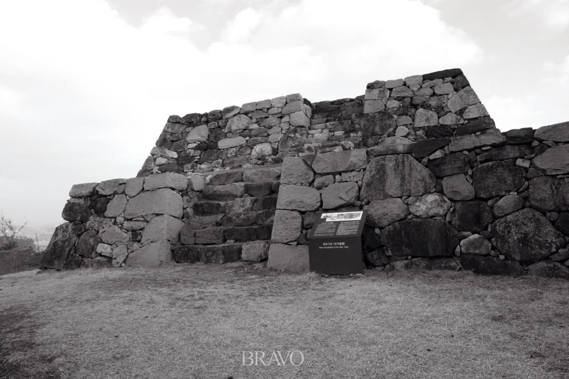 얼마 가지 않아 제2문지가 나오고, 거기서 왼편으로 방향을 틀어 한참을 오르니 병사(兵舍)들이 줄지어 있었을 병영 구역이다. 역시 옛 돌과 새 돌이 뒤섞인 복원 성곽 지대다. 거기서 한 구비 더 오르니 지휘부 건물들이 있었을 혼마루[本丸] 구역이 펼쳐졌다. 학교 운동장만 한 공터 저편 끝에 천수대(天守臺) 자리가 우뚝했다.