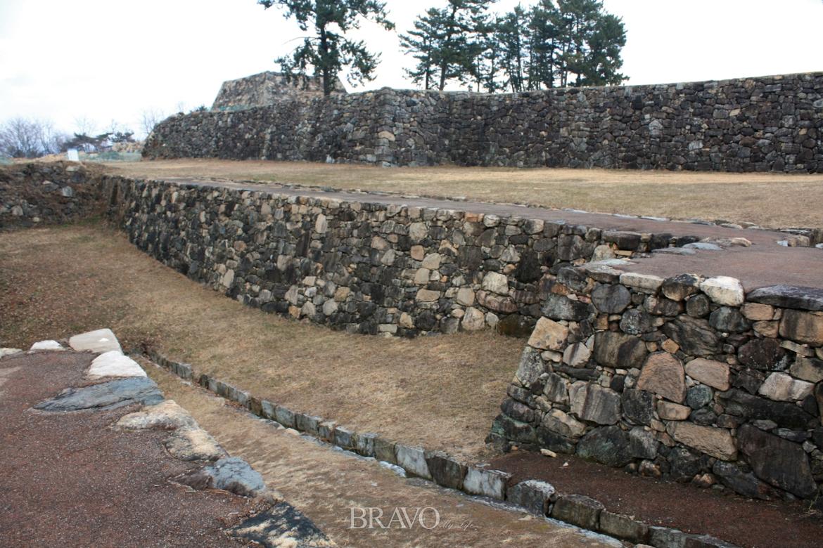 근년에 대대적으로 정비했다는 성터는 말끔해 보였다. 마른 수풀 너머 나지막한 구릉 자락에 문루 터가 눈에 들어왔다. 가까이 가 보니 ‘제1문지(門趾)’라는 안내판이 서 있다. 제1성문 자리인데 문루는 사라지고 돌로 쌓은 기단만 남았다. 그것도 허물어져 덤불 속에 숨어 있던 것을 근래에 다시 쌓은 것이다. 색깔이 어두운 돌은 옛것이고, 밝은 것은 다시 깎은 것이리라. 옛것과 새것의 부조화가 엇박자 같았다.