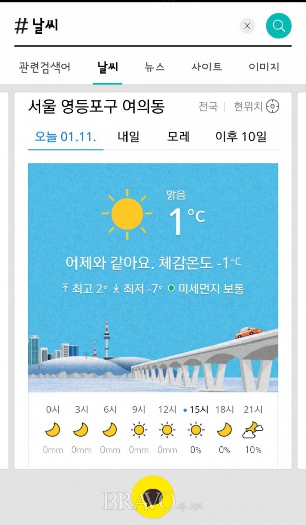 검색창에 ‘#날씨’, ‘#오늘의 날씨’ 등을 치면 현재 위치를 중심으로 한 실시간 날씨를 볼 수 있다. 기온, 바람, 습도, 미세먼지 정보를 제공한다. #오늘의 날씨