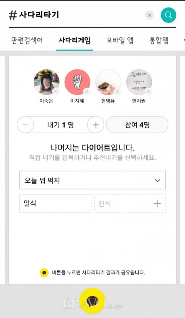 ‘#사다리’를 치면 밥값 내기나  팀 가르기 등을 할 때 재미삼아 해보는 ‘사다리 게임’을 카카오톡 대화방 친구들과 즐길 수 있다.