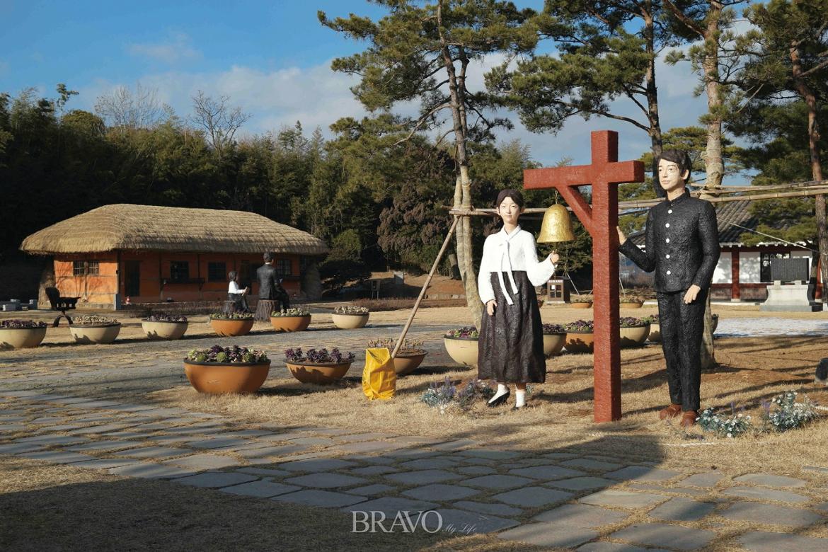 ▲심훈이 <상록수>를 집필한 필경사(충청남도 지정기념물 107호)가 사진 왼쪽이고, 오른쪽은 <상록수>의 주인공인 채영신과 박동혁을 형상화한 것이다.