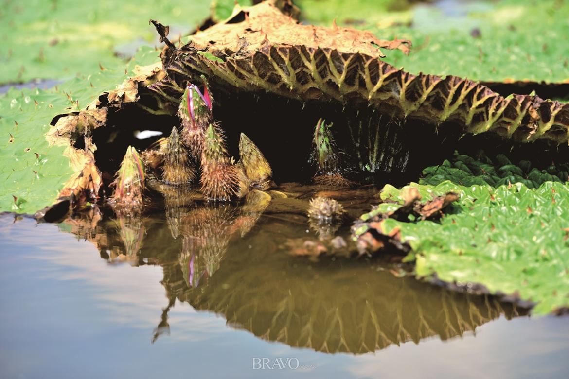 이렇듯 까칠한 가시연꽃이지만, 그 꽃은 모 두를 단숨에 사로잡을 만큼 매력적입니다. 물론 꽃이 피는 과정도 촘촘한 가시나 넓은 잎에 못지않게 기이합니다. 생살을 찢는 고통 속에 새 생명을 낳듯, 가시연꽃도 가시 가 촘촘히 박힌 봉오리로 역시 가시투성이의 두꺼운 잎을 뚫고 올라와 지름 4cm 안 팎의 꽃을 피웁니다. 꽃은 오전에 열었다가 저녁이면 오므리기를 사나흘 되풀이하다 물속으로 들어가 씨앗을 생성하는데, 꽃봉 오리가 맺혔다고 해도 수온과 수심, 기후와 일조량 등이 맞아야 열리기 때문에 활짝 핀 모습을 보기가 쉽지는 않습니다.
