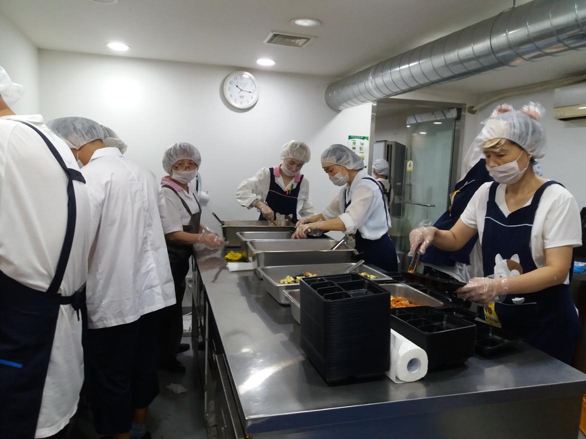 음식을 조리하고 포장하여 도시락을 배송하는 바쁜 작업이 지독한 무더위 속에
