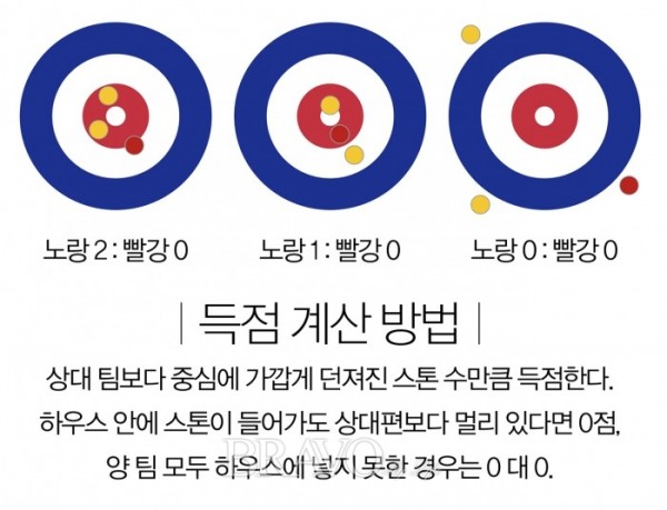 그렇다면 득점은 어떻게 할까? 컬링 경기장은 시트(Sheet)로 불리며 총길이는 45.72m이다. 반대쪽에 과녁같이 생긴 부분을 하우스라고 하는데 이 하우스 안에 스톤이 들어가면 득점이 가능하다. 하지만 무조건 들어갔다고 해서 점수를 받을 수 있는 건 아니다. 중심에 가장 가깝게 위치한 스톤만 득점할 수 있다.