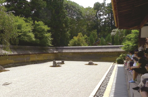 일본 전통정원이 ‘얄미울 정도’로 깔끔하게 가꾸어져 있는 것은 사실이며 그것이 특징이기도 하다. 일본 정원의 나뭇가지는 정원사의 가위와 톱으로 두발(頭髮) 미용하듯 오밀조밀 예쁘게 다듬어져 있다. 한마디로 말하면, 손질로 가공한 조형물인 셈이다. 그래서 일본 정원은 바라봄의 대상이다. 교토시 료안지(龍安寺)의 정원이 그 대표적인 사례다[사진 2].