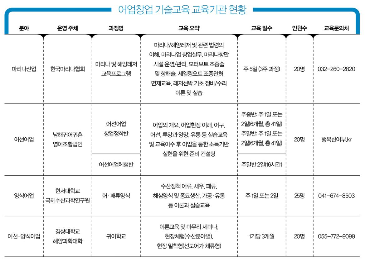 전문가들은 귀어·귀촌을 위한 정보와 기초준비 단계로 귀어귀촌종합센터에서 상담을 받은 후, 각 기관에서 마련하고 있는 교육 프로그램에 참가해볼 것을 권한다. 교육 프로그램은 해양수산인재개발원에서 진행하는 귀어가, 귀어촌 정착교육 과정과 귀어귀촌종합센터에서 개최하는 귀어귀촌아카데미와 코칭클래스가 대표적이다. 또 어선어업, 양식업, 해양레저 등 업종에 따른 전문 교육기관도 있다.