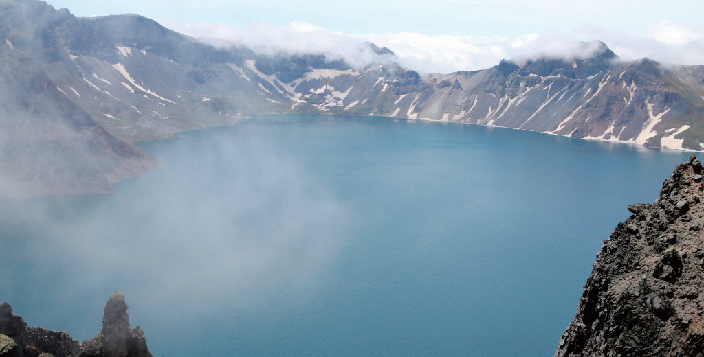 그렇게 10여 분이 지났을까. 갑자기 앞줄에서 사람들이 “우와~” 하며 함성을 질렀다. 천지가 보인다는 것이었다. 그래서 뛰어올라가 보니 과연 천지가 앞에서부터 조금씩 보이기 시작했다. 짙게 가려져 있던 안개는 언제 그랬냐는 듯 마치 극장 커튼처럼 걷히면서 천지의 웅장한 자태를 보여주기 시작했다. 그리고 말끔한 모습으로 우리를 맞이했다. 눈앞에 펼쳐진 고고한 자태는 말로 표현할 수 없을 만큼 감동적이었다. 검은 물결, 그리고 그 뒤에 병풍처럼 펼쳐진 고봉들 위에 아직 남아 있는 잔설은 신비롭기까지 했다. 할 말을 잃고 한동안 눈앞에 펼쳐진 천지를 바라봤다. 감동의 눈물을 흘리는 사람도 있었다. 첫날 정상에서 무난하게 천지를 볼 수 있었다면 이런 감동은 밀려오지 않았을 것이다. 둘째 날도 날씨가 맑아 올라가자마자 천지가 보였다면 기쁨이 덜했을 것이다. 날씨가 화창한데도 천지 쪽은 전혀 보이지 않을 정도로 짙은 안개가 끼어 그토록 애를 태우던 천지였다. 한 시간이나 기다려도 여전히 꿈쩍 않던 천지였다.