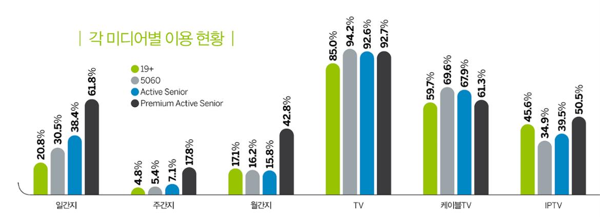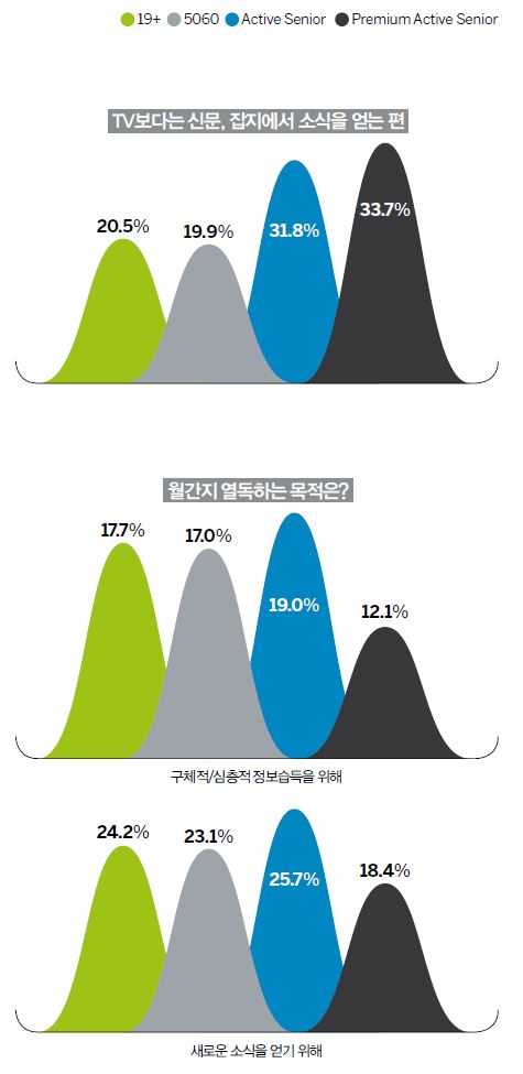 최근 활자 매체시장이 쇠락하고 있는 상황에서 그나마 활자 매체를 선호하는 독자층은 프리미엄 액티브 시니어라고 판단할 수 있는 부분이다. 실제로 TV보다는 신문이나 잡지에서 소식을 얻는 편이라고 대답한 프리미엄 액티브 시니어는 33.7%로 50~60대(19.9%)나 액티브 시니어(37.8%)보다 역시 높았다. 이런 현상은 일종의 ‘정보 쏠림 현상’으로 이어질 수 있음을 예상해볼 수도 있다.