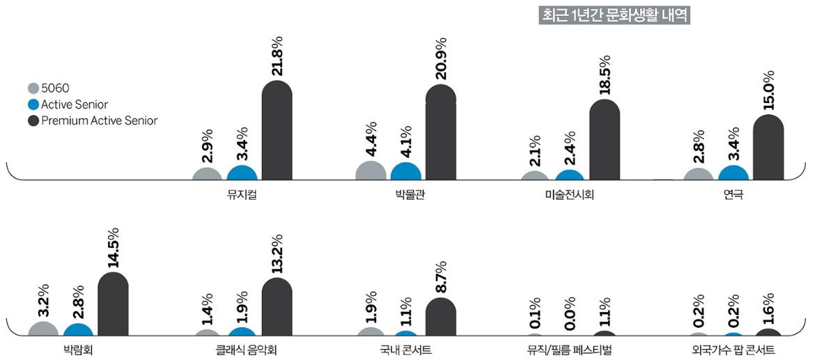 프리미엄 액티브 시니어는 경제력과 직결되는 여가생활에서도 차이를 보였다. 소위 아직까지는 귀족 스포츠로 분류되는 골프가 대표적. 프리미엄 액티브 시니어 중 10명 중 4명은(38.7%) 최근 1년 중 골프 경험이 있다고 답했고, 이와 유사한 41.4%가 최근 1년간 골프웨어를 구입했다고 답했다. 연간 평균 라운딩 횟수는 16.49회였다. 또 해외 골프에 대한 경험 역시 15.6%로 적지 않았다. 뮤지컬이나 미술전시회와 같은 문화생활에서의 차이는 더 극명하게 나타난다. 최근 1년간 프리미엄 액티브 시니어는 21.8%가 뮤지컬을 관람한 적이 있다고 답했지만, 전체 50~60대 중에서는 2.9%만이 경험이 있다고 답했다. 이 숫자의 의미를 다시 계산하면 3299명 전체 50~60대 중 프리미엄 액티브 시니어를 제외하면 뮤지컬을 경험한 시니어는 단 몇 명에 불과하다는 뜻이 된다. 엄청난 차이다. 시내 뮤지컬 극장에서 50~60대 시니어를 만난다면 그는 가구소득 1억 이상의 고소득자라고 단정지어도 거의 틀림이 없다고 간주할 수 있다. 다른 문화분야에서도 이러한 차이는 비슷하게 나타난다. 독서량도 차이가 난다. 프리미엄 액티브 시니어의 절반 이상(50.9%)이 최근 1년간 도서구입 경험이 있다고 했지만, 50~60대는 18.2%만이 경험이 있다고 답했다. 최근 1년 평균 구입 권수 역시 프리미엄 액티브 시니어는 8.9권이라고 했지만, 50~60대는 5.2권에 불과했다. 독서량 역시 차이가 나서 프리미엄 액티브 시니어는 최근 1년간 10.5권을 읽었다고 답했지만, 50~60대는 6.3권을 읽었다고 답했다. 1인당 평균 여행 경비를 묻는 질문에 프리미엄 액티브 시니어는 평균 343만원을 사용한다고 말한 반면, 50~60대 전체는 평균 201만원이라 답해 상대적으로 빠듯한 경비로 해외여행을 하고 있었다.
