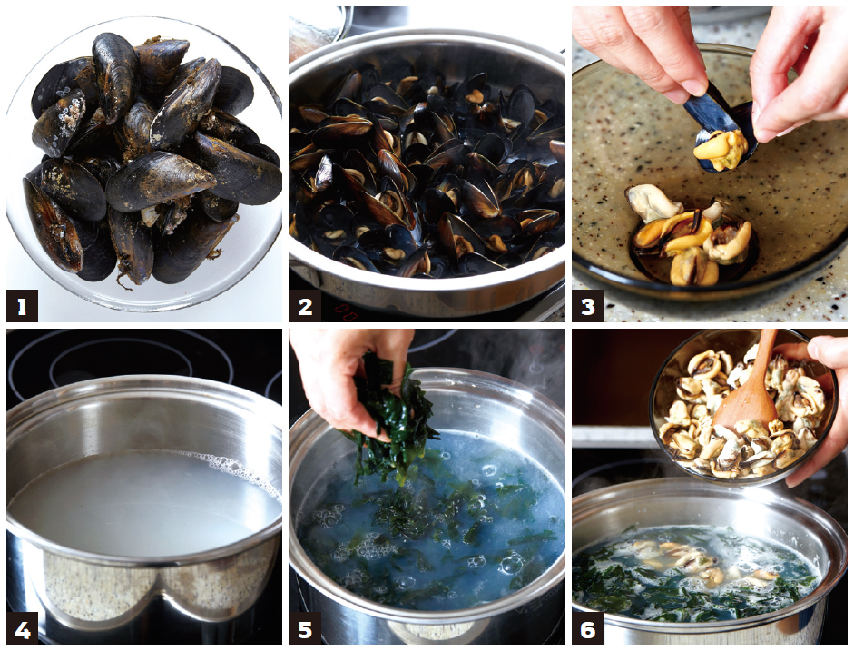 1 홍합은 껍질에 붙은 수초 등을 제거해 깨끗이 씻은 후 옅은 소금물에 해감한다.