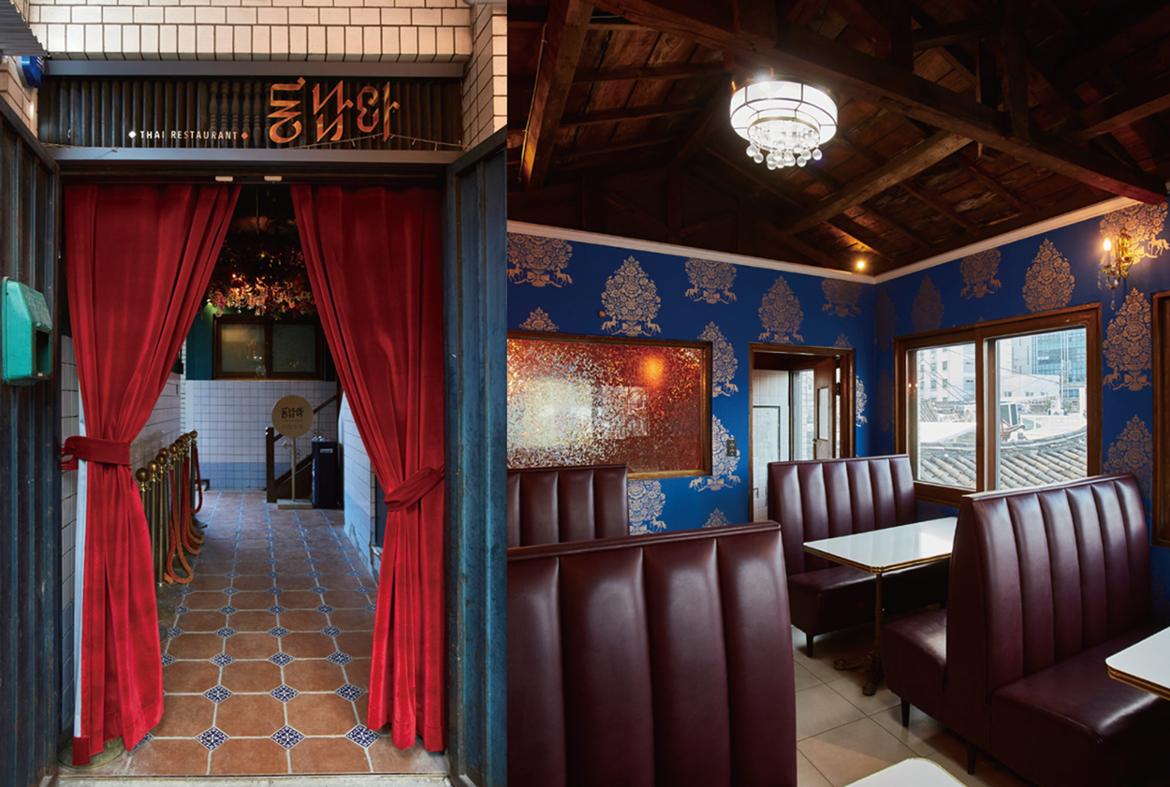 태국요리전문점 ‘동남아’의 입구. 세월이 켜켜이 쌓여 낡은 검푸른색철문을 활짝 열면 레드벨벳 커튼과 이국적인 샹들리에가 맞이한다.겉과 속이 완전히 다른 이 오묘한 식당은 안쪽으로 들어설수록 이색적인 풍경이 펼쳐진다. 한옥을 개조한 실내는 태국 연회장을 모티브로 한 인테리어로, 동남아 여행에서의 아쉬운 마지막 밤을 표현했단다. 메인 홀 외에 공간을 다양하게 나누었는데, 룸마다 강렬한 색감의 독특한 벽지가 눈길을 끈다. 특히 대중탕 욕조(?)를 연상케 하는앞마당의 테이블은 겨울철 식사를 즐기기엔 다소 불편하지만 보는것만으로도 흥미로운 공간이다. 인기 메뉴인 꽃게와 커리로 맛을 낸‘뿌빳 퐁 커리’와 태국식 볶음 쌀국수 ‘팟타이’ 등 현지 셰프가 요리한다양한 오리지널 로컬 푸드를 맛볼 수 있다.