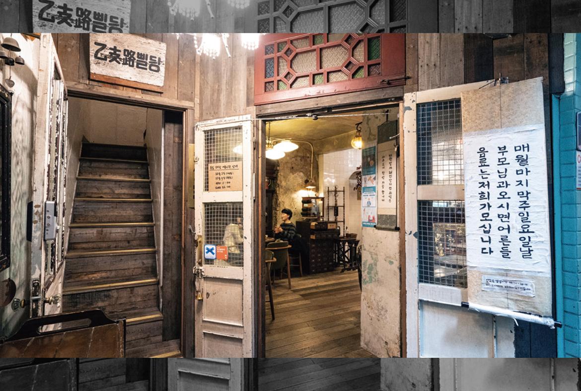 한국전쟁 이후 도시 재건에 필요한 모든 업종이서울 을지로3가와 4가 일대에 자리 잡았다. 공구 골목, 도기·타일 골목, 재봉틀 골목, 조명 골목, 인쇄 골목 등이 거미줄 치듯 모여 거대한 산업단지를 이뤘다. 주변으로 고층 빌딩이 우후죽순 들어서도 을지로는 여전히 예전 모습을 유지하고 있다. 일과를 마친 노동자들이 ‘동원집’의 감잣국으로 허기진 배를 채우고, 1000원짜리 노가리 안주에 시원한 생맥주를 마시며 회포를 풀던 노가리 골목도 여전하다. 노가리 골목은 오히려 지금이 더 전성기인 것 같다.후미진 인쇄소 골목에는 임대료가 저렴한 건물을 찾아 들어온 예술가와 젊은 창업자들이 정착하고 있다. 카페, 술집, 음식점도 많이 생겼다.대부분 을지로 특유의 허름한 분위기를 부각해건물을 꾸몄다. 카페 ‘커피한약방’과 양과자점‘혜민당’이 대표적이다. 이곳은 개화기 때 차림으로 입장해야 할 것 같은 분위기다. 촌스러운색유리 창문, 100년 된 자개장, 페인트칠이 벗겨진 나무 문, 전깃줄이 뒤엉켜 있는 골목 풍경이 내다보이는 2층 테라스마저 멋스럽게 보이니, 내 눈이 ‘복고깍지’를 쓴 것이 틀림없다.