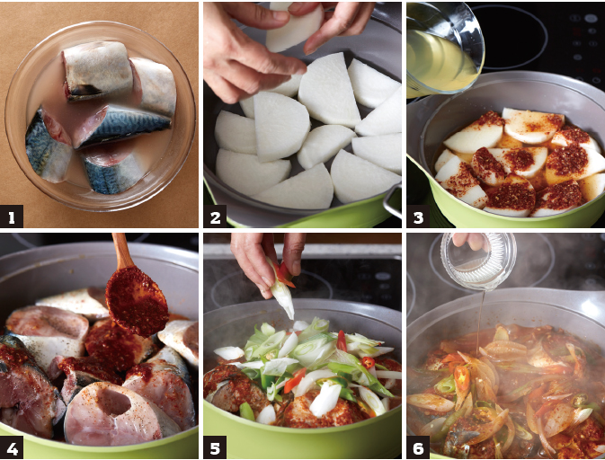 고등어 500g, 무 400g, 양파 ½개, 대파 1대, 청양고추 2개, 홍고추 1개, 멸치육수 3컵, 청주 1큰술, 소금 1작은술, 파기름 1큰술