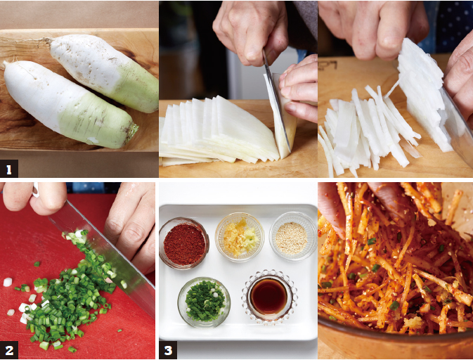 3 채 썬 무에 분량의 양념장을 넣고 가볍게 버무린다.