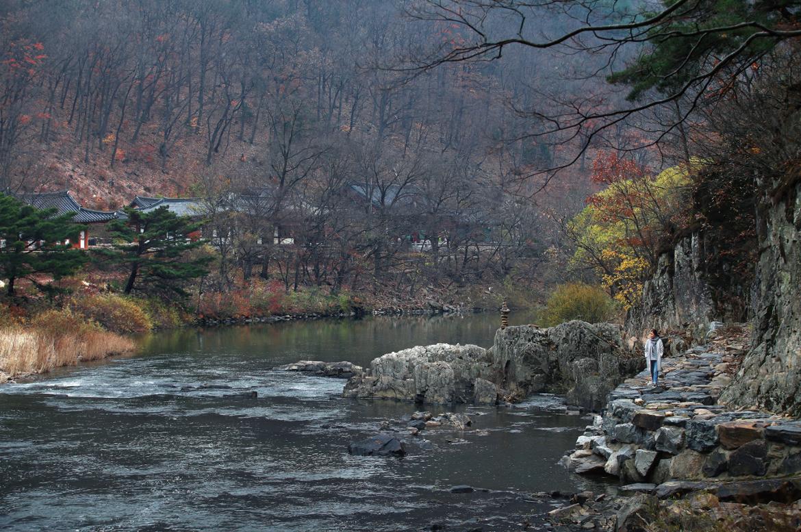 산골짝 사이로 강물이 흐른다. 강 따라 이어지는 숲길은 선율처럼 부드럽다. 오솔길 위에 곱살한 낙엽들 폭신히 얹혀서다. 얼마 전까지만 해도 이 숲엔 화염이 너울거렸으리라. 붉디붉은 단풍이 산을 태우고 숲을 살랐으리라. 그즈음, 조용히 흐르는 강물 위에 어린 건 홍조(紅潮) 아니면 황홀한 신열이었을 테지.