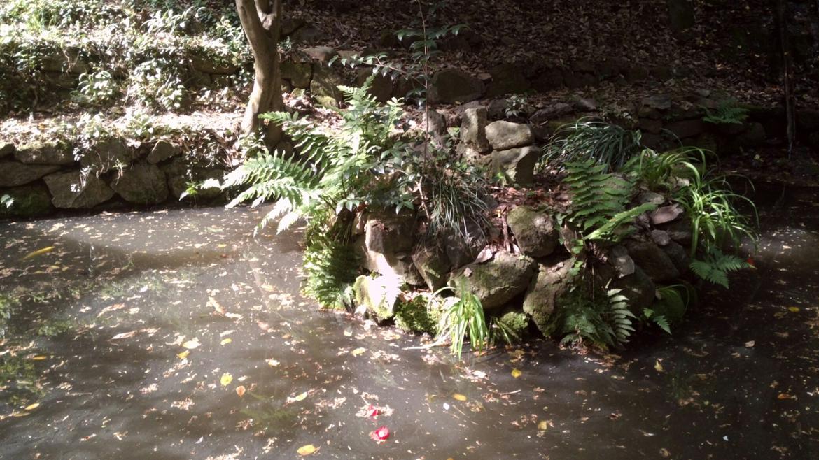 작은 연못에 동백꽃이 떠 있다.