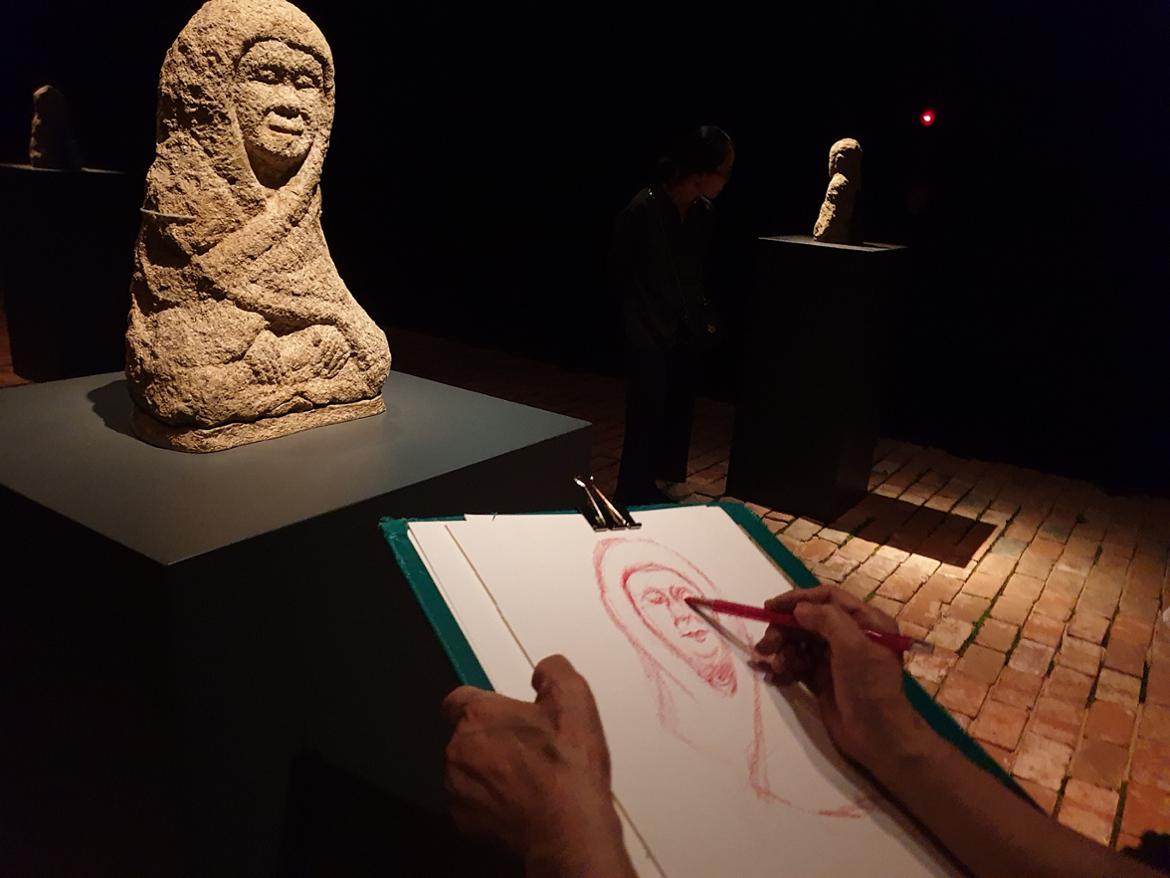 어두운 전시관, 희미한 빛을 등불 삶아 나한을 스케치하는 분이 계셨습니다. 나한의 표정에서 느껴지는 분위기와 온화함을 직접 느껴보고 싶으신가 봅니다.