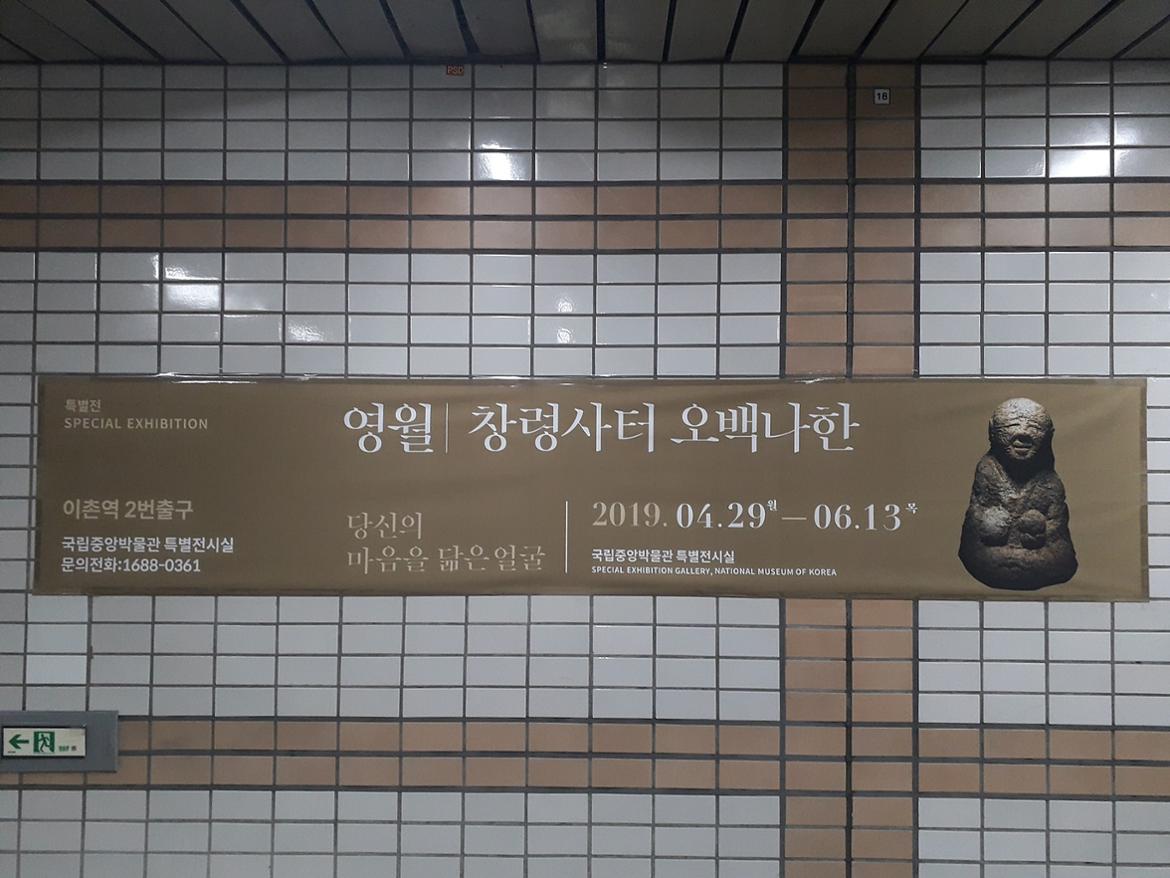 전철을 이용해서 국립중앙박물관에 도착했는데요, 전철역 안에는 ‘영월 창령사터 오백나한’ 홍보용 포스터가 한쪽 벽을 차지 하고 있었습니다. 이촌역에서 하차해서 몇 번 출구로 나가야 될지 좀 헷갈렸는데요. 포스터가 떡하니 나타나서 제대로 왔구나 하고 안심이 되었습니다. 눈치채셨나요? 그렇습니다. 오늘 제가 친구랑 박물관에서 관람할 전시는 바로 창령사터 오백나한전입니다. 그리고 뮤지컬도 한편 관람할 예정입니다.