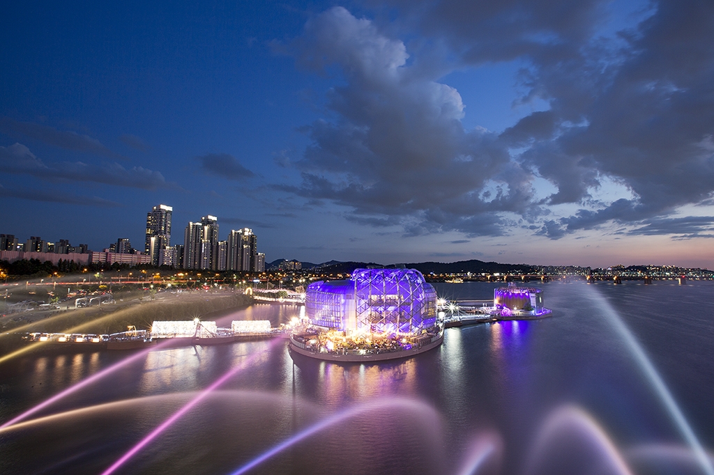 해가 기울면 꽃을 형상화하여 조성한 ‘세빛섬’의 미디어 파사드쇼가 더욱 화려해 진다.
