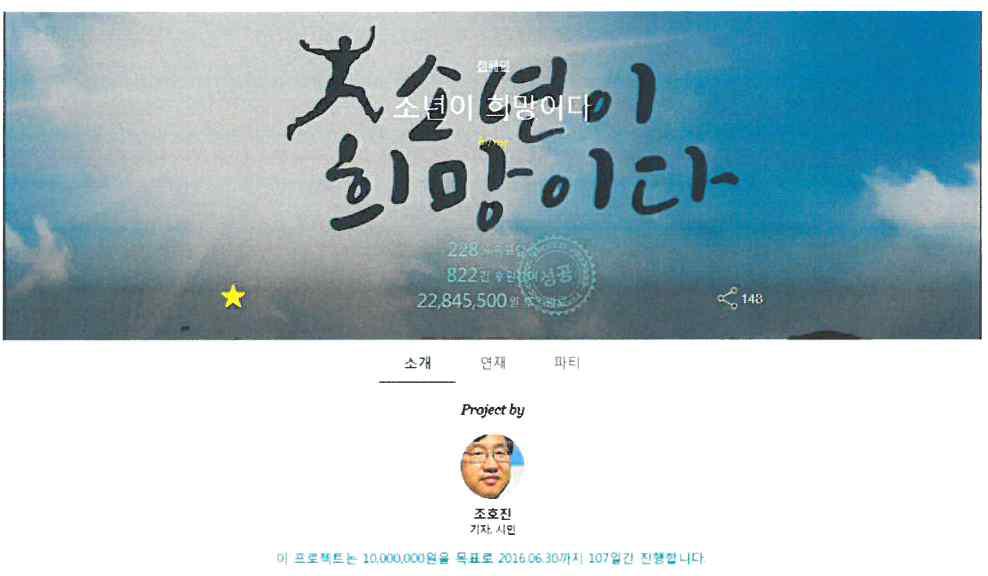 저는 2015년 7월부터 11월까지 4개월 여간 〈오마이뉴스〉와 다음 스토리펀딩에서 〈소년의 눈물〉이란 제목으로 소년범과 거리소년 등의 위기 청소년에 대한 이야기를 연재해 3천여 명의 독자로부 터 7천여만원을 후원 받았습니다.