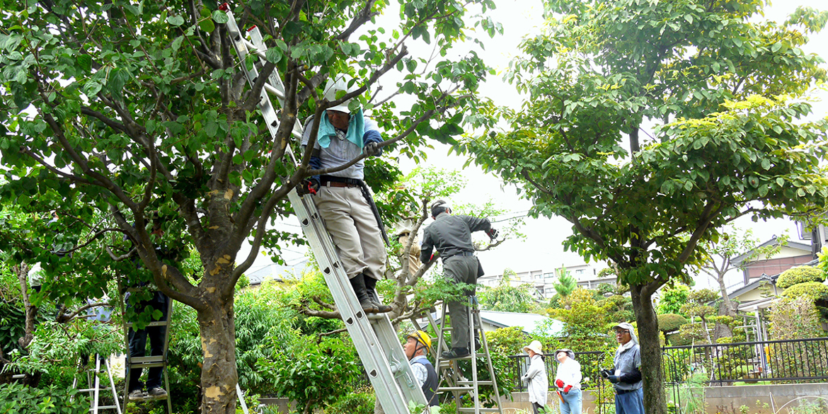 나뭇가지 치기도 실버 센터에서 하는 경우는 중기(重機)를 다룰 수 없고, 일정한 높이를 넘은 수목은 취급할 수 없는 등 제한이 있다라고 반도 씨는 말한다.