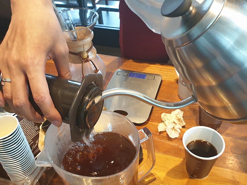 마치 과학 실험실을 방불케 했는데요. 에어로프레스를 이용해서 커피를 추출하면 커피 맛이 내린 사람에 따라 크게 달라지지 않는다고 합니다.