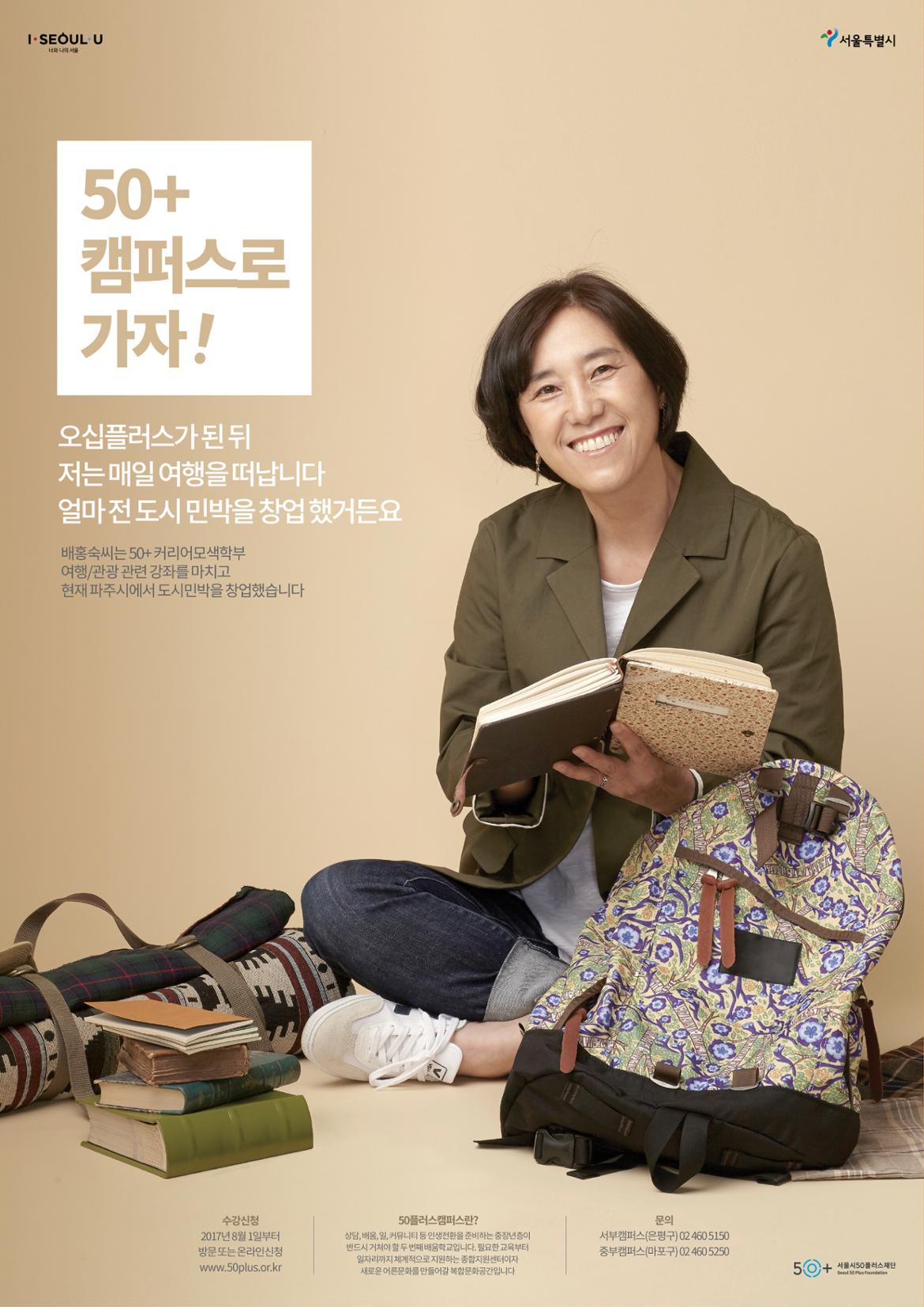그런데 가끔 어떤 분들은 마치 내가 예뻐서, 혹은 사진에 잘 받는 얼굴이어서 모델이 된 거로 얘기하시는데 그건 절대 아니다. 50+캠퍼스의 홍보모델이 된 사연을 길게 얘기하려면 1박 2일 거리가 될 수도 있겠지만 짧은 글로도 충분할 거 같다.