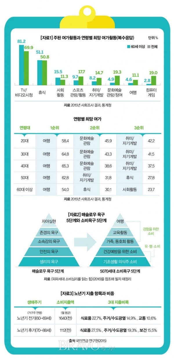 이처럼 5070세대의 ‘나를 행복하게 하는 소비’를 위해서는 ‘갖고 싶은 것’에서 ‘하고 싶은 것’으로 소비 패러다임이 바뀌어야 한다. 일본에서도 여가활동의 주역이 10대에서 60대 이상으로 변하고 있다고 한다. 일본생산성본부에 따르면, 고수입의 활동적인 70대가 레저시장의 주도세력이다.