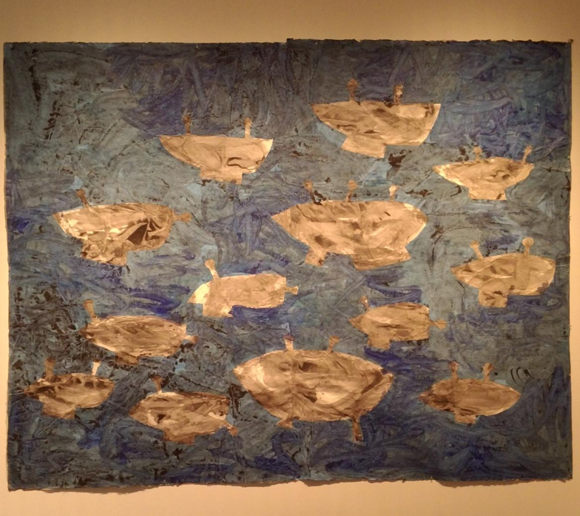 큰 붓으로 화살표와 선들을 그려놓은 “생명의 시초(1984)”는 마치 다른 작가의 그림을 보는 듯 익숙했다. 어느 시기에 비슷한 그림을 그린 작가들이 있었는데 노은님도 그런 경향의 그림을 그렸구나 생각했다. 나는 “나뭇잎배(1987)”라는 작품이 마음에 들었다. 작은 곤충이 나뭇잎을 타고 있는 모습이다. 배에 탄 곤충들의 표정이 어찌나 신난 개구쟁이처럼 보이는지 ‘뭐가 그리 재미있느냐?’고 ‘어디로 가느냐?’고 묻고 싶었다.