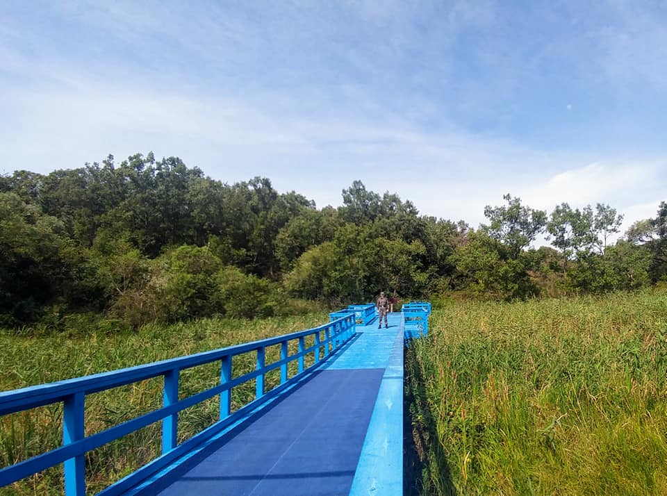 기념식수 좌측길로 걷다보면 양측 정상이 담소하며 함께 산책후 단독 회담을 이어간 화제의 장소인 도보다리가 보인다. 파란 색칠로 단장한 50m 길이의 산책 다리는 이제는 휠체어를 타고 지나 갈 수 있을 정도로 증축되어 잘 정돈되어 있었다.