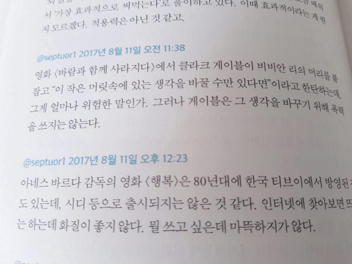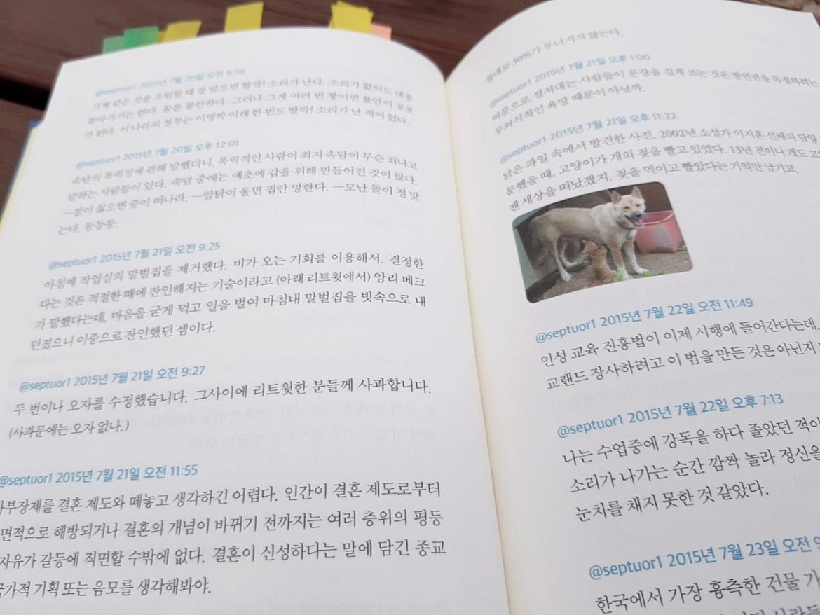 2015년 7월 20일에 올린 이 트윗을 읽은 시간은 가을 햇살 쨍하니 맑았던 얼마 전 추석날이었다. 담양의 소쇄원에서였다. 4년 전에 남긴 말. 이토록 짧은 글들 쯤이야 순식간에 읽고 지나가리라, 생각의 조각에 불과하니 마음에 남는 것도 없으리라 싶었는데, 그렇지 않았다. 한 페이지 넘길 때마다 무릎을 칠 만큼 좋아 자꾸 포스트잇을 붙이게 되었다. 공교롭게도 딱 이걸 읽고 밑줄을 그으려고 할 때 일이 벌어졌다.