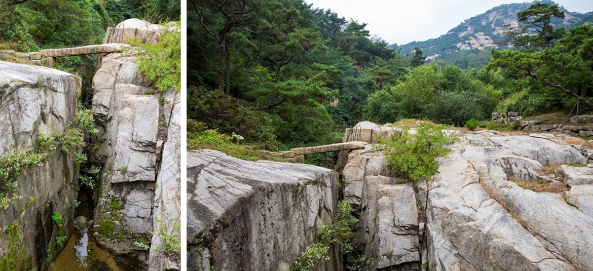 이 두 개의 물줄기가 계곡 아래에 걸려 있는 돌다리인 기린교에서 합류하여 청계천으로 흘러들었습니다.