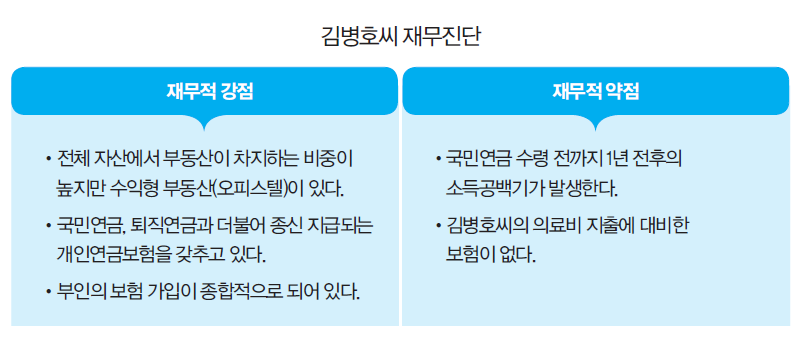 김병호씨의 경우에는 연금과 부동산 임대수익만으로도 현재의 생활비를 감당할 수 있다. 다만 고액의 치료비가 요구되는 질병이나 장기간 간병을 받아야 하는 경우가 발생하면 현재의 수입으로는 어려움을 겪을 수 있다. 고령화로 인해 갈수록 치매 등 장기간병 상태의 환자가 증가하면서 장기간병보험의 보험료가 비싸지고 있는 추세다. 김병호씨 부부가 가입한 종신보험은 1급의 장해(치매로 인하여 항상 간호를 받아야 하는 경우 포함) 상태가 되었을 때 사망보험금(1억원)을 지급하는 보험상품이다. 그리고 꼭 치매가 아니더라도 고액의 치료비가 발생한 후 사망했을 때 사망보험금이 유가족의 부담을 줄여줄 수 있기 때문에 현재의 종신보험은 계속 유지하는 것이 좋다.
